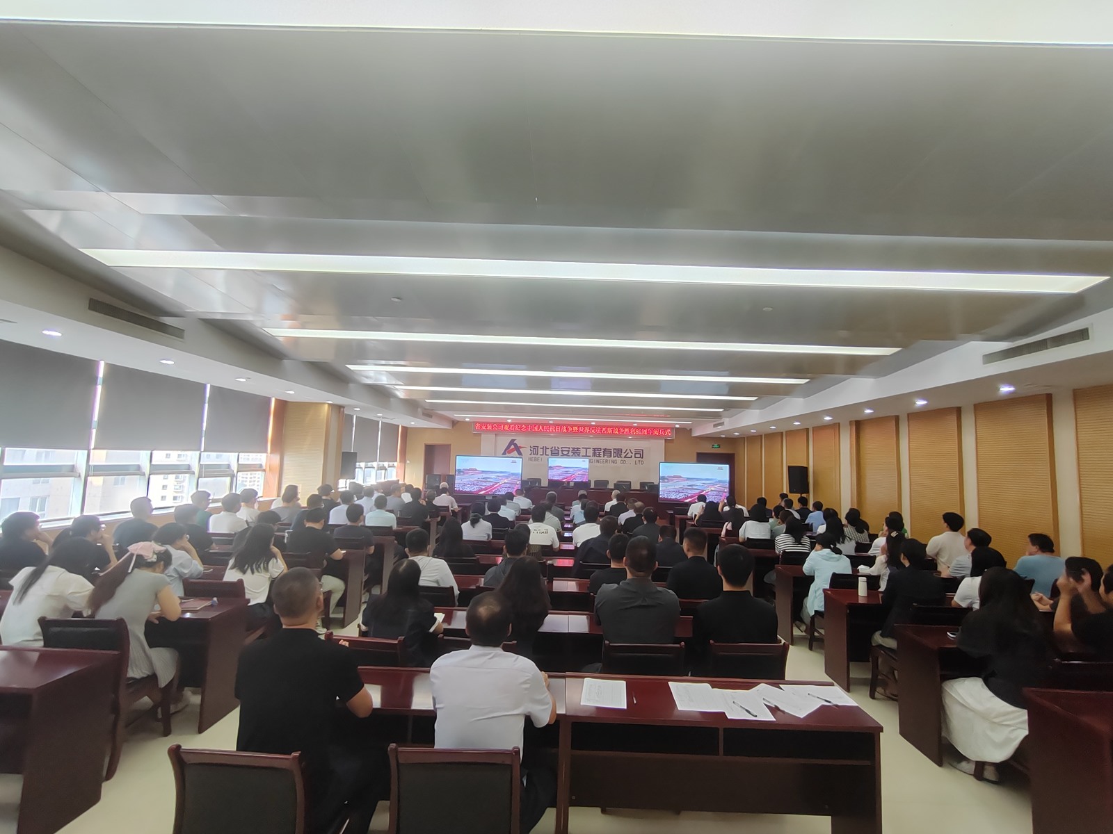 2025年9月3日,為紀念中國人民抗日戰爭暨世界反法西斯戰爭勝利80周年,河北省安裝工程有限公司積極組織職工集中觀看閱兵盛況直播。公司機關及各分公司、項目部共計2000余人通過多種方式同步參與,共同回顧歷史、緬懷先烈、展望未來。